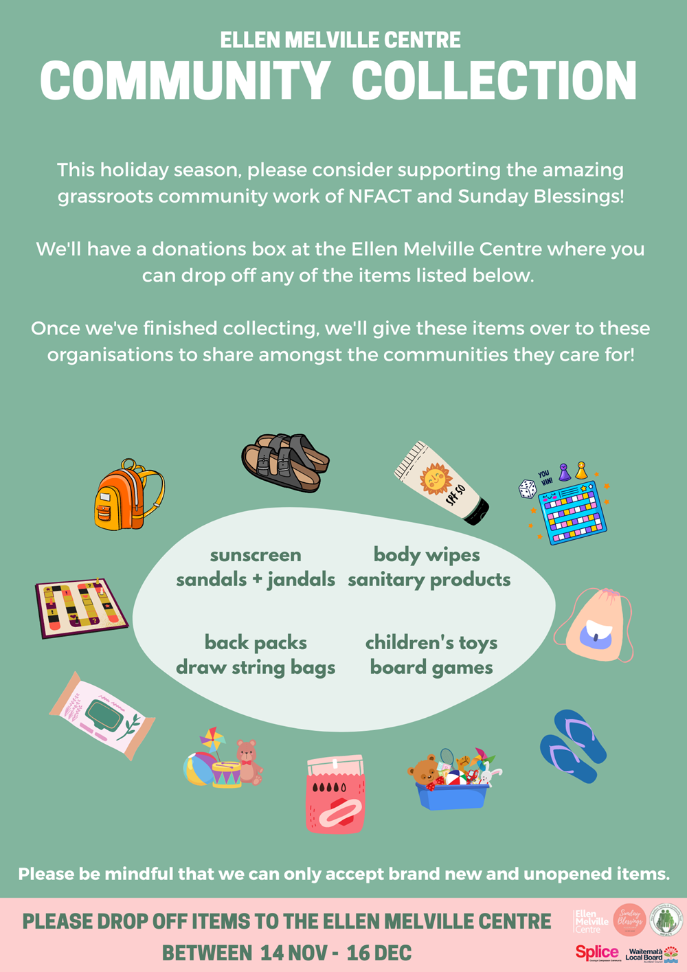 In the mood for giving? Items collected at the Ellen Melville Community Centre will be provided to families through New Settlers Family and Community Trust (NFACT).
